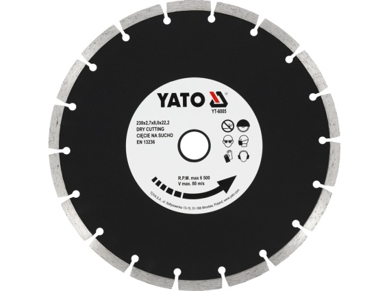 Tarcza diamentowa segmentowa 230 mm do cięcia betonu, muru, cegły i granitu. Segmenty 8 mm spawane laserowo, praca na sucho, do 6 500 obr./min, stal 65Mn.