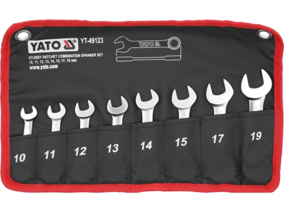 Zestaw 8 krótkich kluczy płasko-oczkowych z grzechotką YATO ze stali CrV. Klucze mają satynowe i chromowane wykończenie, twardość 42–46 HRC oraz grzechotkę 70-zębową. Dwunastokątny profil oczka gwarantuje pewny chwyt. W komplecie praktyczne etui.